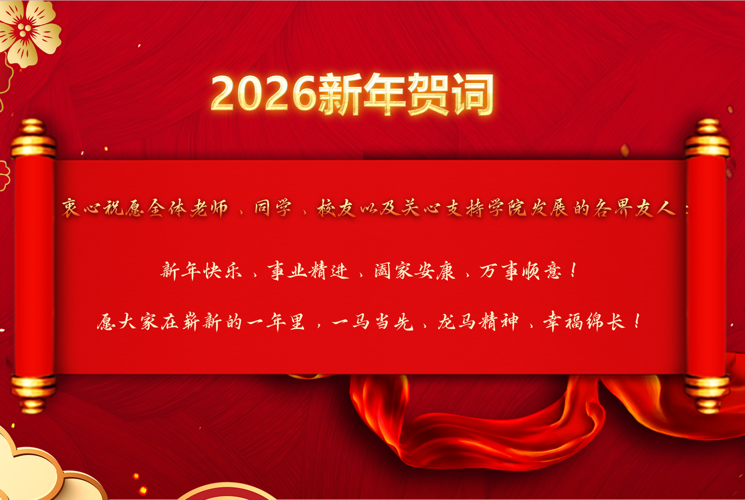 亲爱的老师们、同学们、校友们、各界朋友们:金蛇蕴瑞辞旧岁,马跃平川启新程。在2026年即将到来之际,我们向辛勤耕耘的全体老师,向奋发求知的莘莘学子,向奋战在祖国各地的广大校友,向长期关心支持学院发展的各界友人,致以诚挚的问候和美好的新年祝福!回望2025年,在校党委、校行政的坚强领导下,学院坚持以习近平新时代中国特色社会主义思想为指导,以党建引领凝心铸魂,把握人才培养“基本盘”、下好资源“盘活棋”、跑出发...