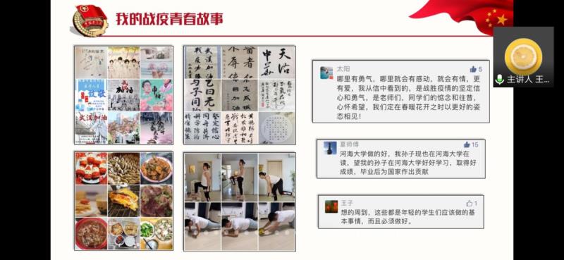 粟洨悦同学从在校学生志愿者的视角,讲述了一线抗疫工作者的所见所闻,并结合自身感受深情阐释出疫情之下当代青年应承担的责任与使命。闫晓彤同学从“战‘疫’有我,爱国力行”的主题出发,分别从“所见、所思、所得、何为”四个方面分享自己在服务工作中收获到的力量与感动。普月同学分享了自己的战“疫”日记,号召青年学生要勇于担当,积极贡献青春力量。王琛同学则以抗疫期间“河海学子青春故事”微信编稿的角度,带领广大团员深刻体验疫情防控工作的不易。