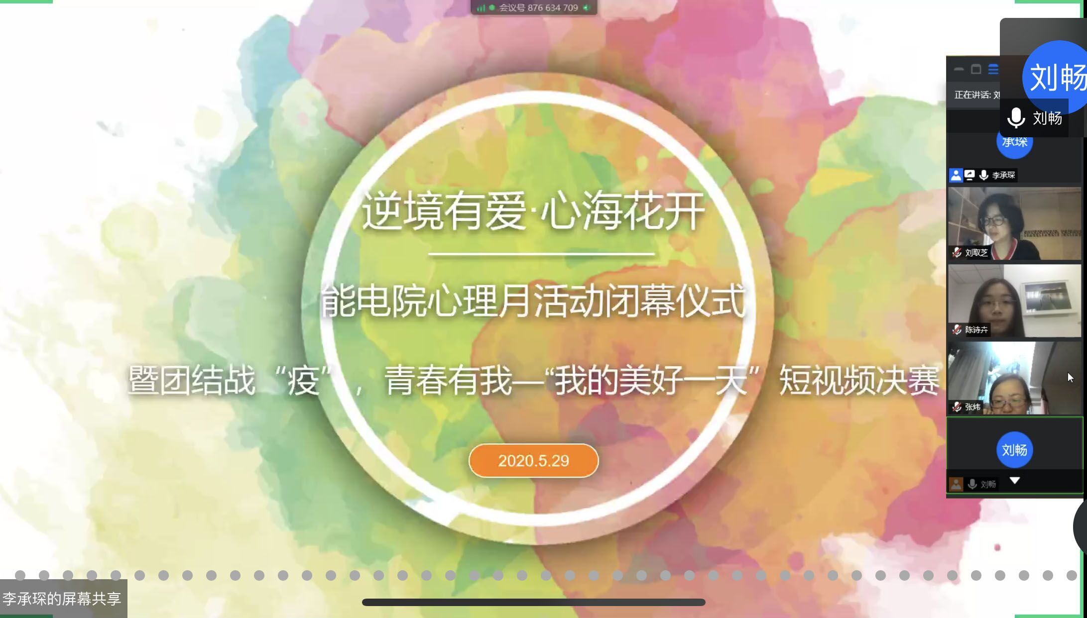 5月29日晚,能电院心理活动月“团结战’疫’,青春有我—我的美好一天”短视频大赛在网络平台顺利举办,学院心理健康教育月活动落下帷幕。短视频大赛邀请到了国产探花 心理健康教育与研究中心主任刘取芝、专职心理老师陈诗卉作为专业评委,学院党委副书记张炜出席并总结寄语。含少数民族生在内的12名参赛选手轮流展示个人作品,同时在线观看人数达到近200人。