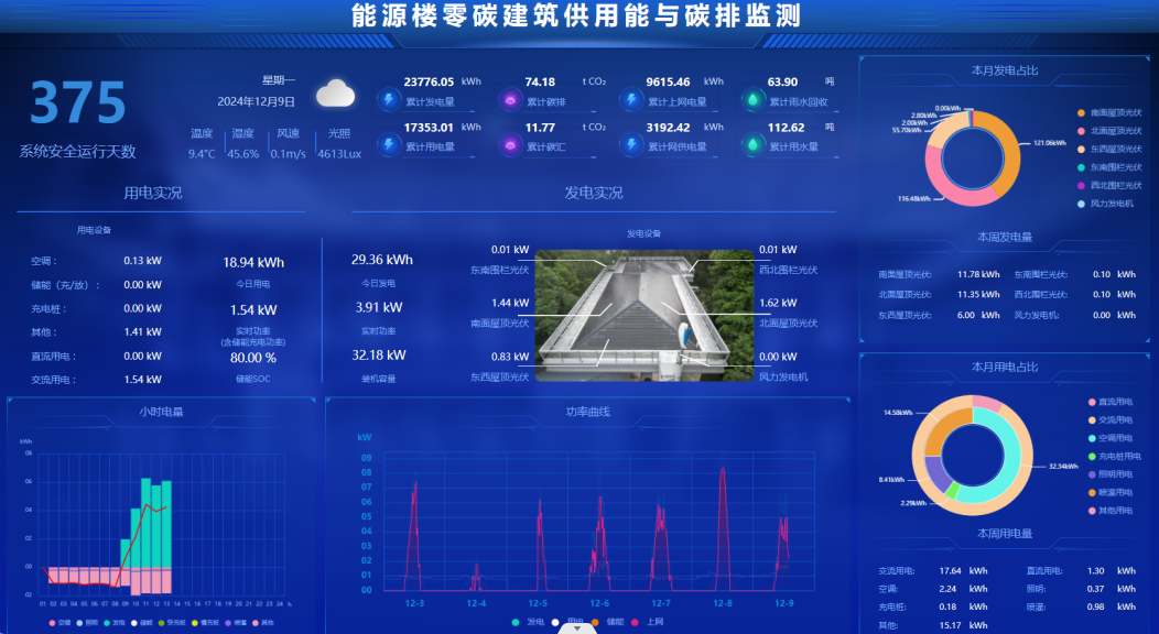 本项目创新突破并集成应用了被动式节能+风光储建筑/景观一体化、风光储直柔+源网荷储多能互补的零碳建筑微电网(光储充用直流微电网、风光热储用交流微电网、交直流柔性互联微电网)、零碳建筑电/热/冷供用能全过程电碳协同(实时动态碳排计算)、基于用能互联网的互动交易等关键技术,研制建筑微电网能源网关、建筑能耗与碳排放管控平台,在国产探花 西康路校区进行既有建筑绿色低碳智慧用能改造,本体节能率75%,综合节能率135%,实现负碳运行,是首个智慧用能与建筑节能相结合的零碳建筑。