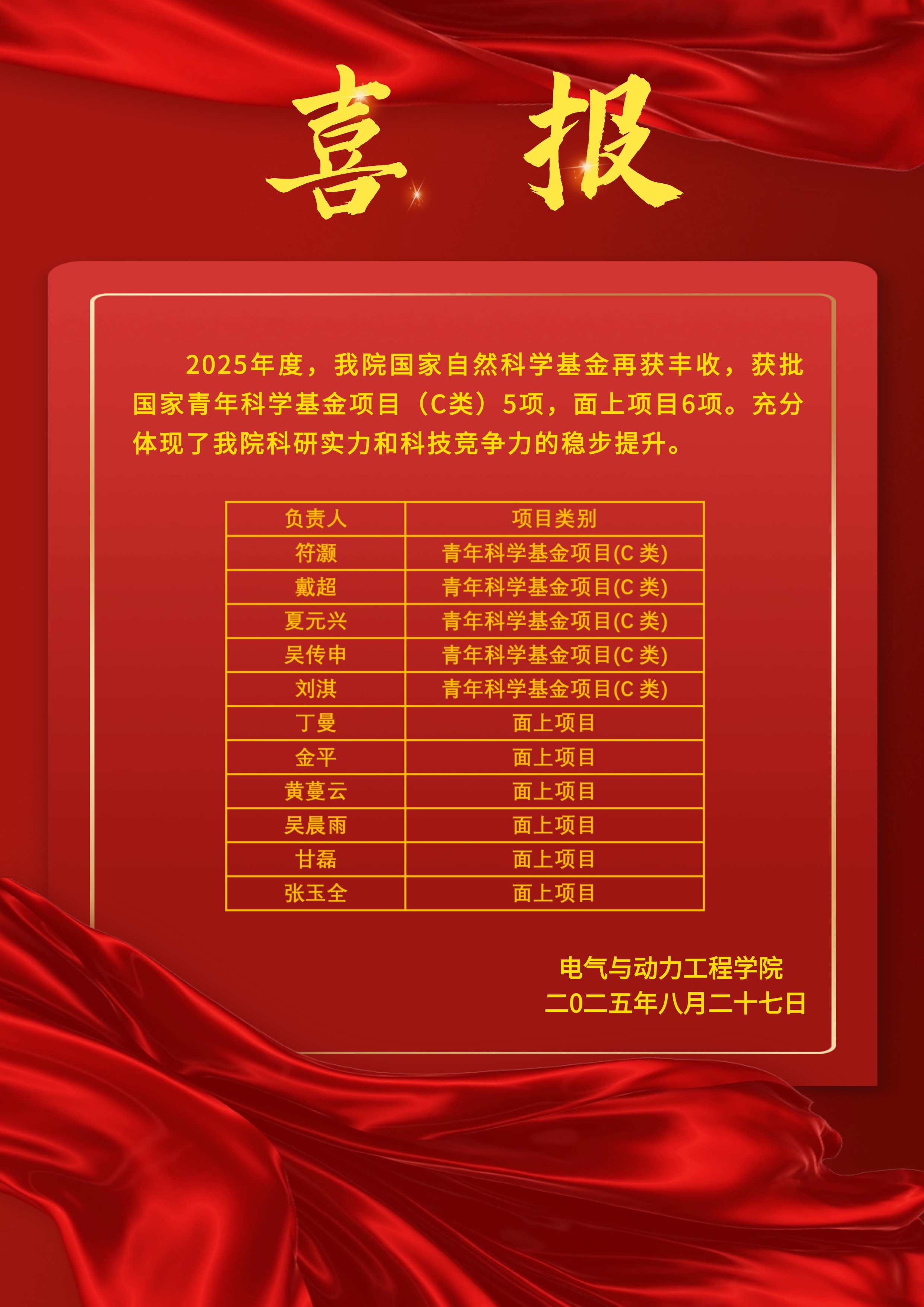 近日,国家自然科学基金委员会公布了2025年度项目评审结果。电气院本年度共获批项目11项。其中:面上项目获批6项,资助率17.6%;青C项目获批5项,资助率31.2.%。立项数量与资助经费创历史新高,彰显了学院雄厚的科研实力与创新活力。这一成绩的取得,是全院教师勤奋钻研、共同努力的成果,也是学院科研组织工作持续优化的体现。