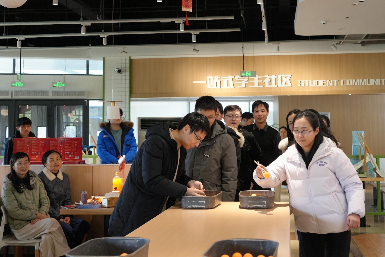 随着互动环节的开启,现场气氛迅速升温,欢乐氛围直达顶峰。“筷子夹乒乓球”接力赛率先登场,参赛教师们凝神聚力、默契配合,在限定时间内争分夺秒完成挑战,灵巧的动作与紧张的节奏引得台下掌声、欢呼声不断,既考验手部协调性,更彰显团队协作力。随后,“听歌识曲”“你画我猜”等趣味游戏轮番上阵,老师们踊跃参与、各展所长,诙谐的互动、默契的配合与意外的笑点让现场笑声此起彼伏,台上台下融为一体,彻底沉浸在轻松愉悦的节日氛围中。
