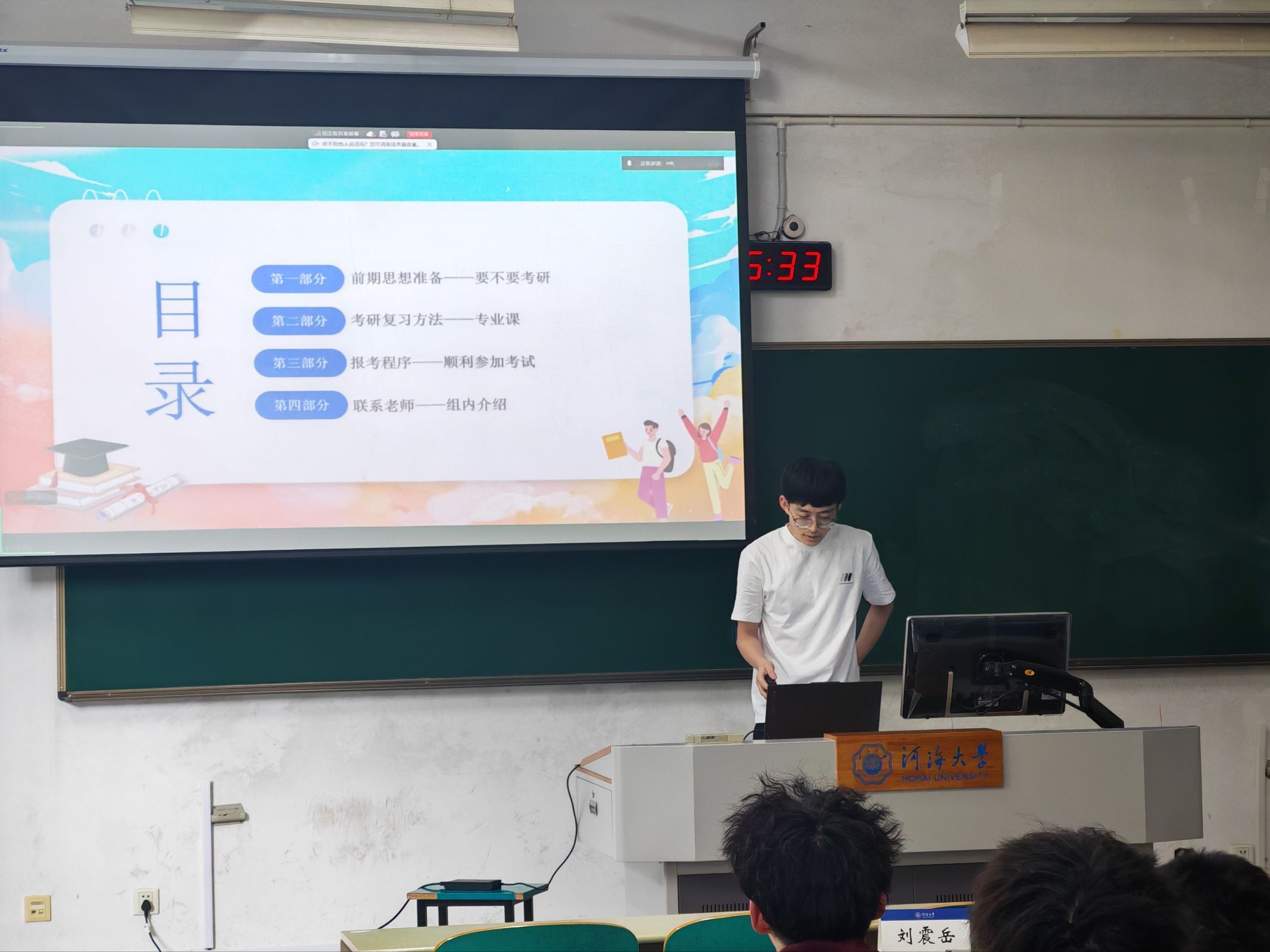 刘震岳同学则聚焦考研专业课与报考程序,带来极具实操性的建议。他提醒同学们“先确定院校,为目标努力”,避免盲目报考,同时关注官网动态以防专业课改考。在专业课备考上,他主张分阶段推进:前期梳理框架、暑期强化做题、秋季真题训练、考前全真模拟。他还详细介绍了报考程序中的关键节点,如预报名、正式报名、线上确认、准考证打印等,并鼓励有意报考国产探花 的同学提前联系导师,做到“少鸽子、讲诚信”。